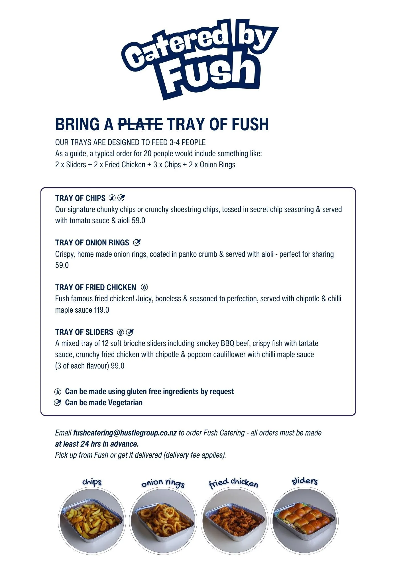 Email fush@hustlegroup.co.nz to order - all orders must be made at least 24 hrs in advance.