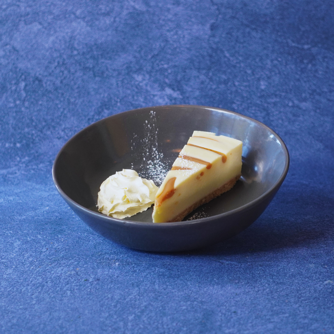 A piece of delicious salted caramel cheesecake, served with whipped cream