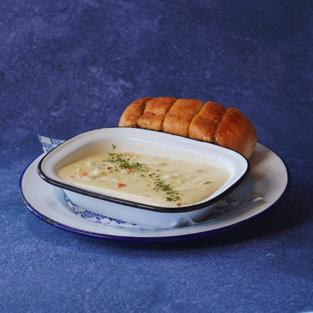 Creamy chowder chocker full of fresh kaimoana, served with garlic bread