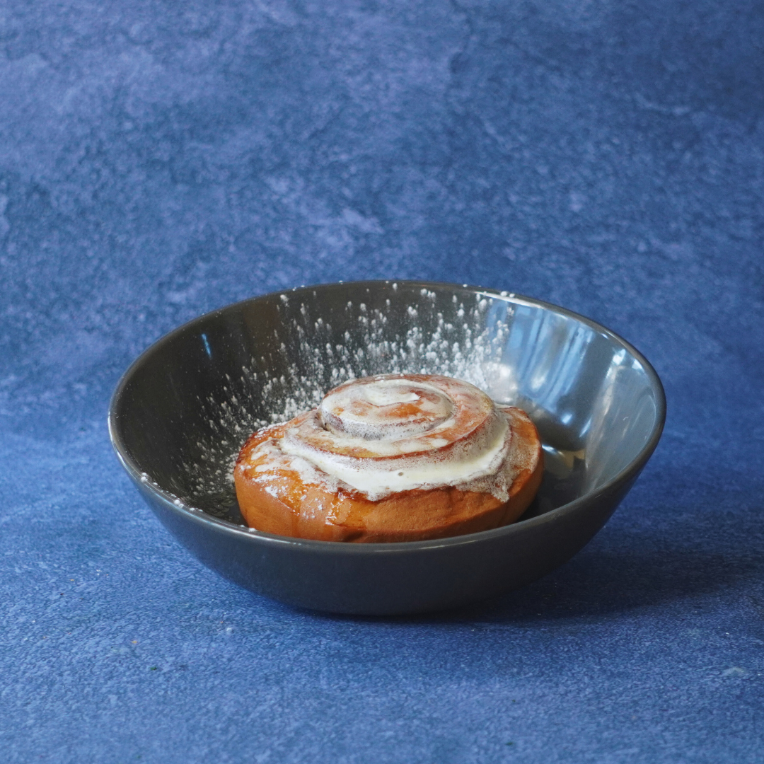 A soft, sweet and warm cinnamon bun completely covered in icing