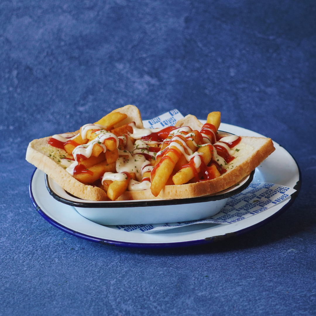 Two slices of white bread, crispy chips, covered in tomato sauce & aioli
